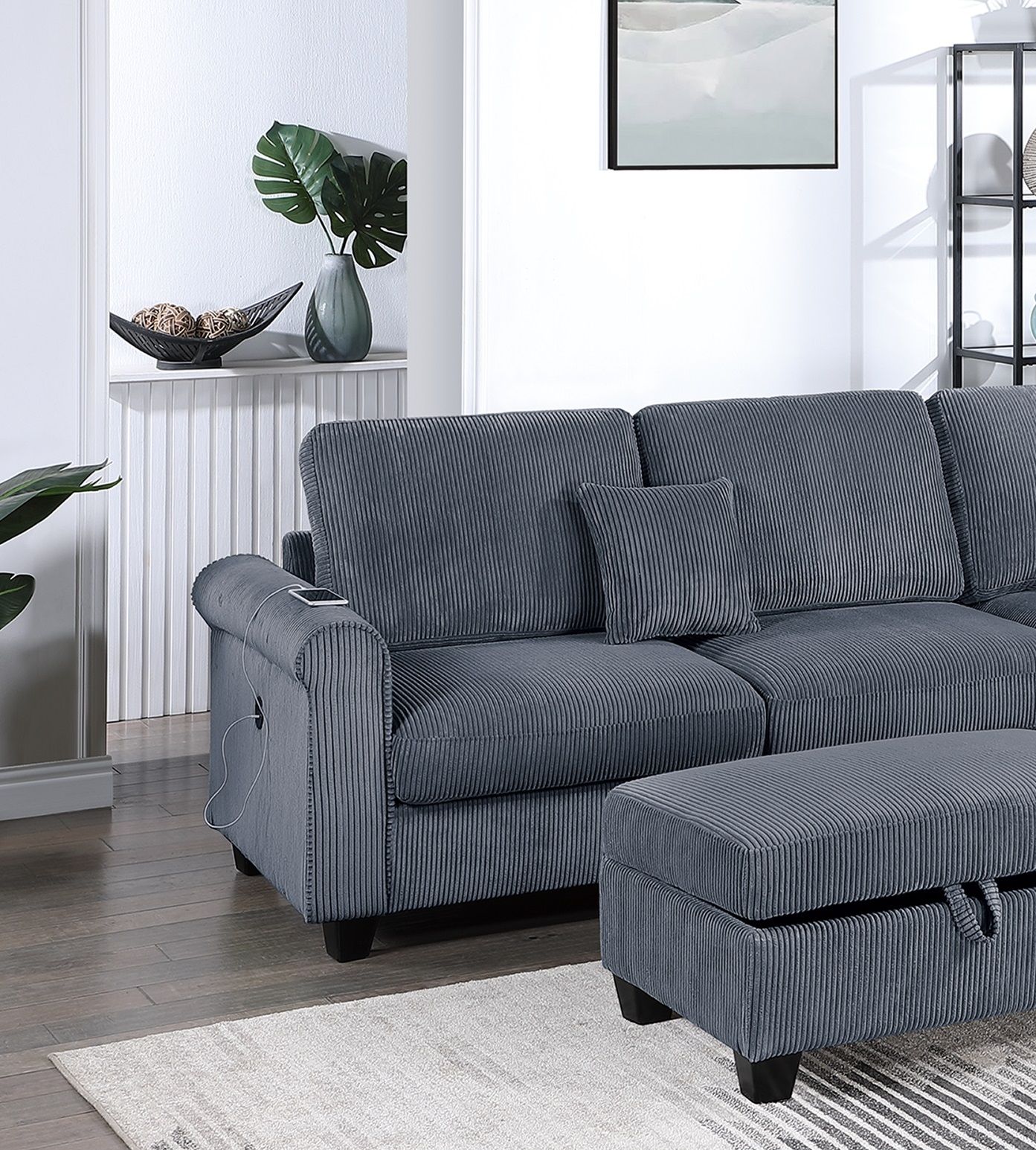 This 3-Piece Sectional Set is designed to redefine comfort and style in your living space. Experience convenience at your fingertips with the Left Arm Facing (LAF) Sofa, featuring a built-in USB port for easy charging of your devices. Sink into relaxation with the Right Arm Facing (RAF) Chaise, offering ample space to stretch out and unwind after a long day. Making it the perfect spot for lounging, reading, or simply enjoying your favorite movie. Maximize your living room storage with the included Storage Ottoman, perfect for stashing away blankets, magazines, or remote controls, it seamlessly blends style with functionality. Crafted with corduroy material soft to the touch and adds a touch of sophistication to your living space. Complete with two throw pillows, this 3-Piece Sectional Set is the epitome of modern elegance and comfort.
