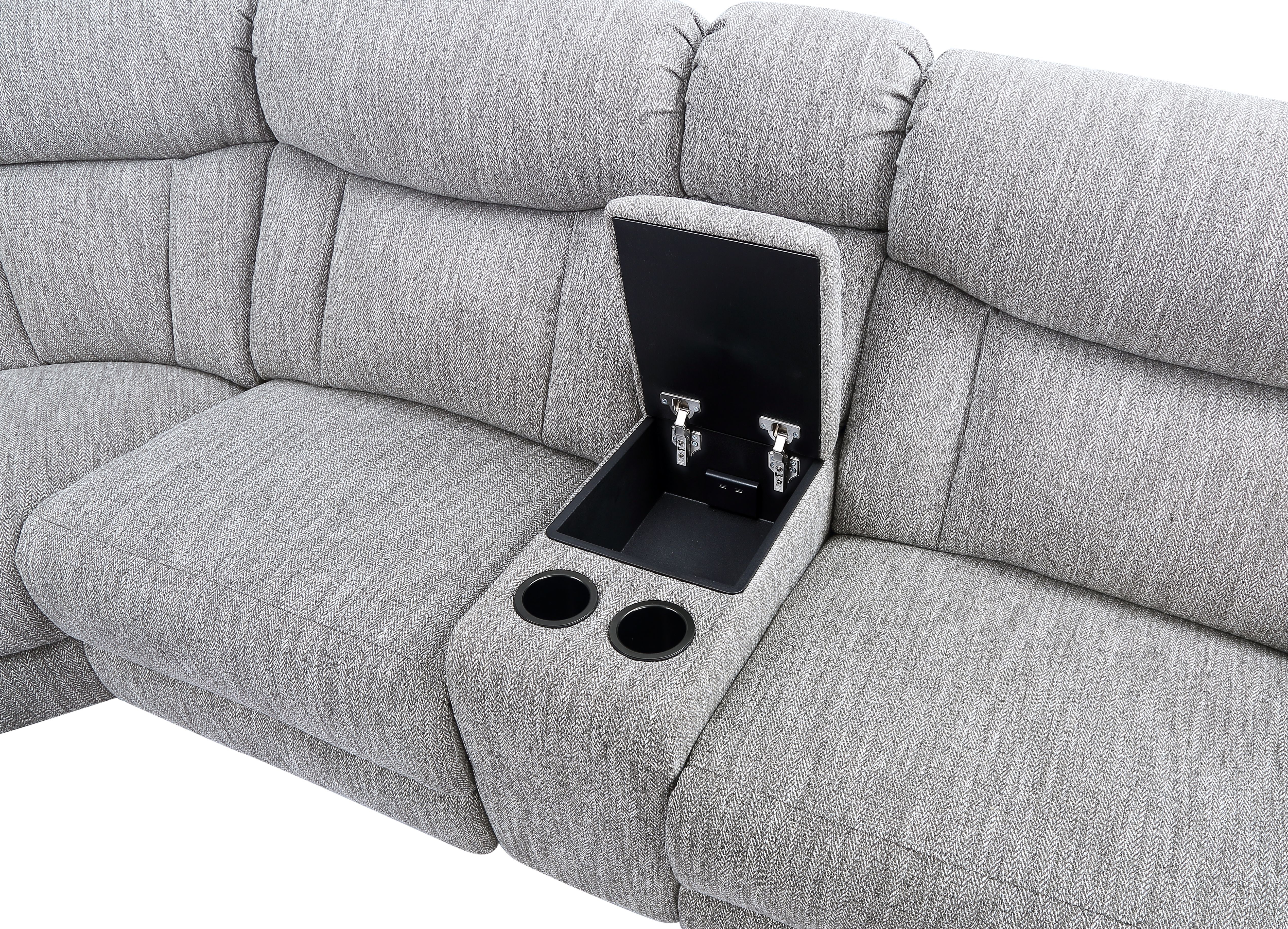 Lift-Top Console offers convenient storage for remotes and electronics with 2 conceaed USB charging ports and 2 cupholders